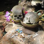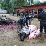 Oproti všem očekáváním jsme nenavštívili jatka nýbrž pohřeb v kraji Tana Toraja na jižním Sulawesi. Rituální zabíjení buvolů je zde součástí pohřebního obřadu, který je i bez toho dostatečně bizardní. Když člověk umře, uloží se do postele v domě, napustí formalínem a do doby pohřbu se k němu chovají jako k nemocnému. Pohřeb může být klidně i za rok, protože pozůstalí potřebují čas na sehnání dostatečného množství prasat a buvolů, kteří se na pohřbu zabijí. Tato zvířata mají potom nebožtíka doprovázet na jeho cestě na onom světě. Rakev se po pohřbu neuloží do země, ale do skály nebo ke stropu jeskyně, aby měl kratší cestu do nebe. I po smrti se nosí mrtvému dárky, leckdy v podobě cigaret, které uloženy vedle lidských lebek tvoří komické výjevy jako z kampaně proti kouření. Samotný rituál zabíjení buvolů je nejdůležitějším v celém procesu. Buvoli jsou zde velmi ceněni a život každého Torajana se v podstatě točí jen kolem shánění peněz na nákup buvolů. Ten nejdražší , albín, může stát až půl milionu korun. Normální stojí stejně jako auto a průměrný Torajan si vydělá kolem 1000kč za měsíc. Když už na jednoho našetří, koupí, zemře dědeček a buvol musí na porážku…